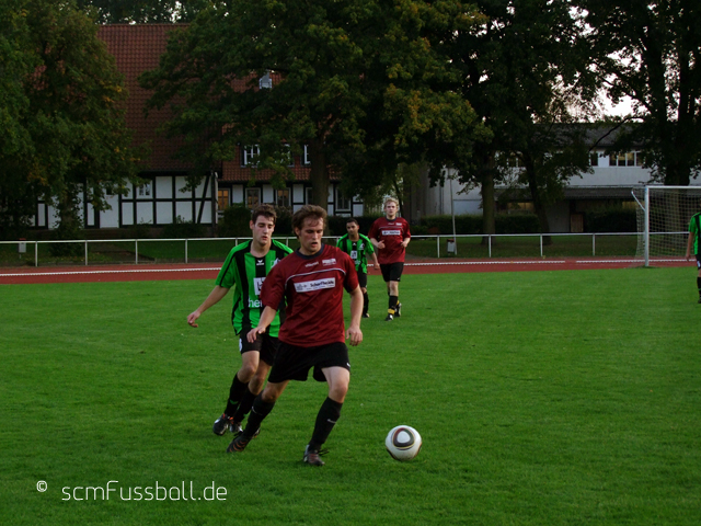 Von Beginn an wollten wir das Spiel durch ein verstärktes Mittelfeld (3:5:2) gleich in die Hand nehmen und so den Gegner möglichst früh unter Druck setzen. Jedoch scheiterte in der ersten Halbzeit dieses Vorhaben immer wieder an überhasteten oder unkonzentrierten Aktionen, trotz spielerischer Überlegenheit. In der 38. Minute erlöste uns dann Alex Kavermann mit dem verdienten 1:0; mit einen bis dato seltenen, aber dazu schönen Spielzug auf der rechten Seite eingeleitet durch Mario Stiegemeyer.
